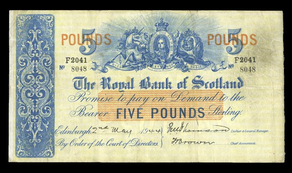 Scotland. Royal Bank of Scotland. 5 Pounds. 1944. P-317c. Signatures: Thomson - Brown. Blue and orange-brown. Crowned cameo flanked by unicorn and lion upper center. VF, small, thin 'razor' slot near "D" in denomination, light soiling.