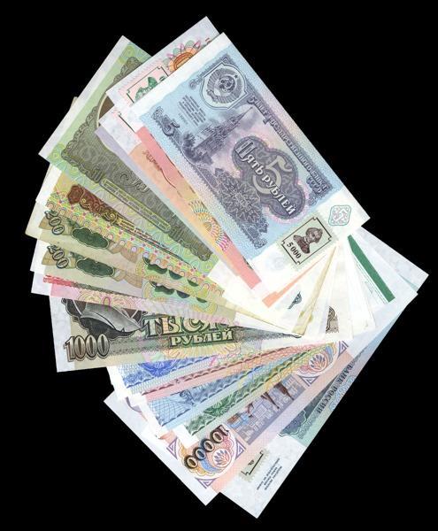 Transnistria. Lot: Government 1994 Provisionals (Suvorov stamps on Russian notes) - 10 (2, both types), 25, 50, 100, 200 (2, both types), 500 and 1000 Rubles; 5,000 Rubles on 5 Rubles (2, both types). P-1-3, 5, 7, 8, 9, 11, 13. 14 A&B; Bank Nistriana. 1993-4 issues: 1, 5, 10, 50, 100, 200, 500 Rubles. P-16 to 22; also unlisted Suvorov stamps on Bank of Russia 5,000 and 10,000 (P-252, 253) notes; and unlisted 10,000 Ruble 1996 (?) provisional. The P-8 only Very Fine, the rest Uncirculated. [21]