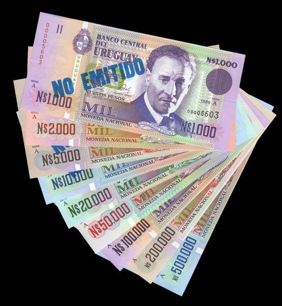 Uruguay. Banco Central. Full Set of the 1989-1992 issue. 1000-500,000 Nuevos Pesos. P-67A-73. The 1,000, 5,000 and 10,000 being specimens. Various large portraits on fronts; scenes, allegories and buildings on backs. The highest value has a thumb pressmark on the edge from counting, the others with light pressmarks on ends from banding, AU-Unc. [9]