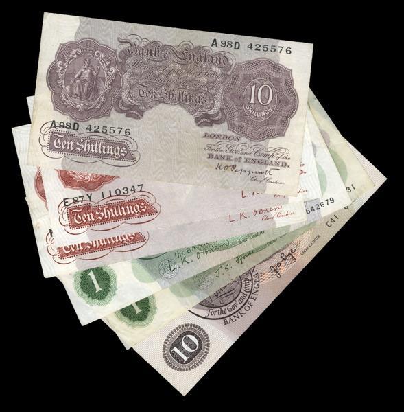 Mixed lot of World Banknotes, 1898-modern: Includes: Great Britain. 10 Pounds (1970-5). P-376c. EF, bottom centerfold repaired; 10 Shillings (1940-8). P-366, and (1955-60). P-368c (2), 1 Pounds (2); various notes from Germany, France, Russia, Italy, Zambia, Japan, Belgium, Laos, China, etc. One or two fair-G, the rest VG-Unc. [48]