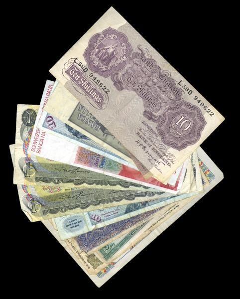 World Paper Money. Small hodgepodge of mostly WWII-era or pre-WWII -- some, though later, largely European issues. Some with edge curling, on average VG-VF. [64]