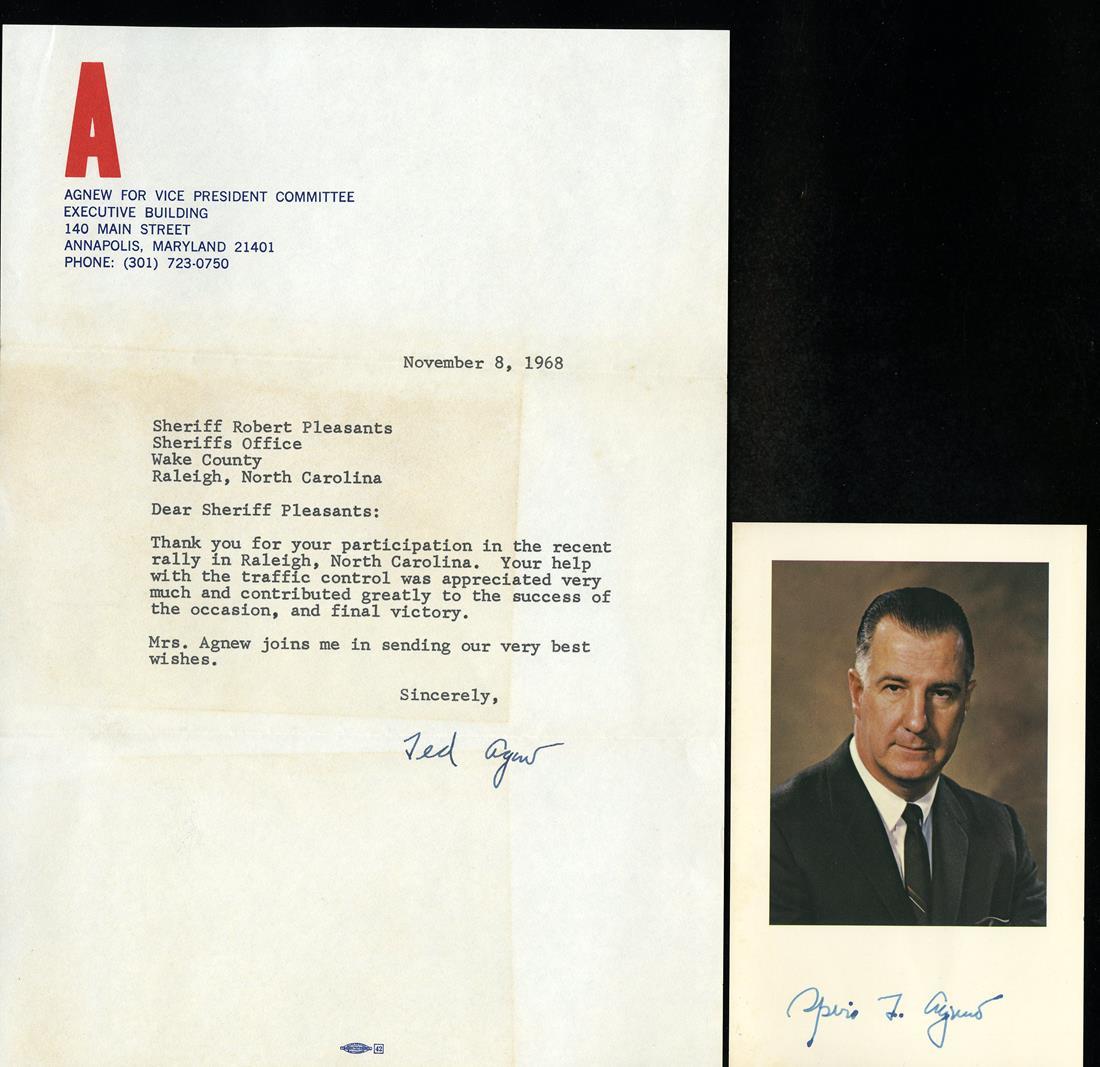 Agnew, Spiro Theodore. 39th Vice-President of the United States (1969-1973), Greek-American politician, governor of Maryland. Letter Signed "Ted Agnew". One page, typed, on "Agnew for Vice President Committee" letterhead, 7 1/3 x 10 ½", Nov. 8, 1968. Agnew thanks Sheriff Robert Pleasants for his participation in a rally in Raleigh, NC. Accompanied by a 3 ½ x 5 ½" color photo of Agnew signed "Spiro T. Agnew" in blue ink. Very Fine. [2]