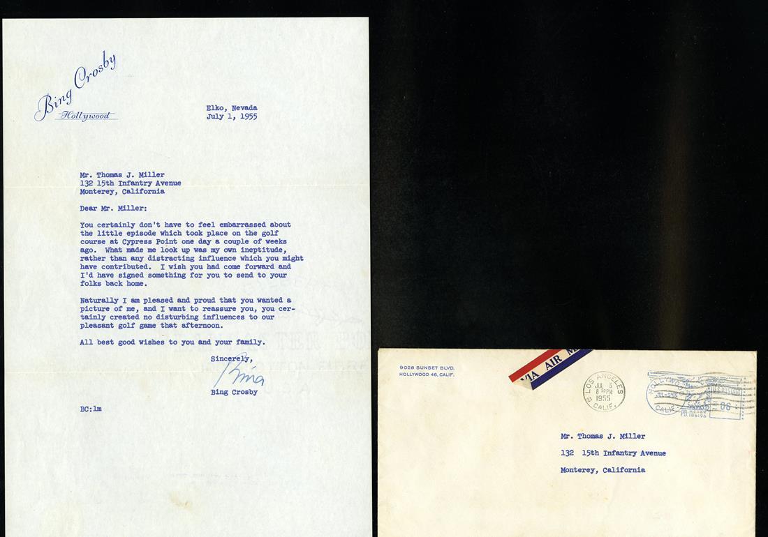 Crosby, Harry Lillis "Bing", Jr.. Giant of song and the silver screen, renowned for his warm bass-baritone voice; in a 1948 poll, voted "the most admired man alive."Letter Signed "Bing". One page typed on Crosby letterhead, 7 1/3 x 10 ½", Elko, Nevada July 1, 1955. Bing tells fan not to feel embarrassed about the "little episode" on the golf course at Cypress Point when the fan sought a photo and sends his best wishes. Trifold, trivial stain, Very Fine. Accompanied by the letter's postmarked envelope. [2]