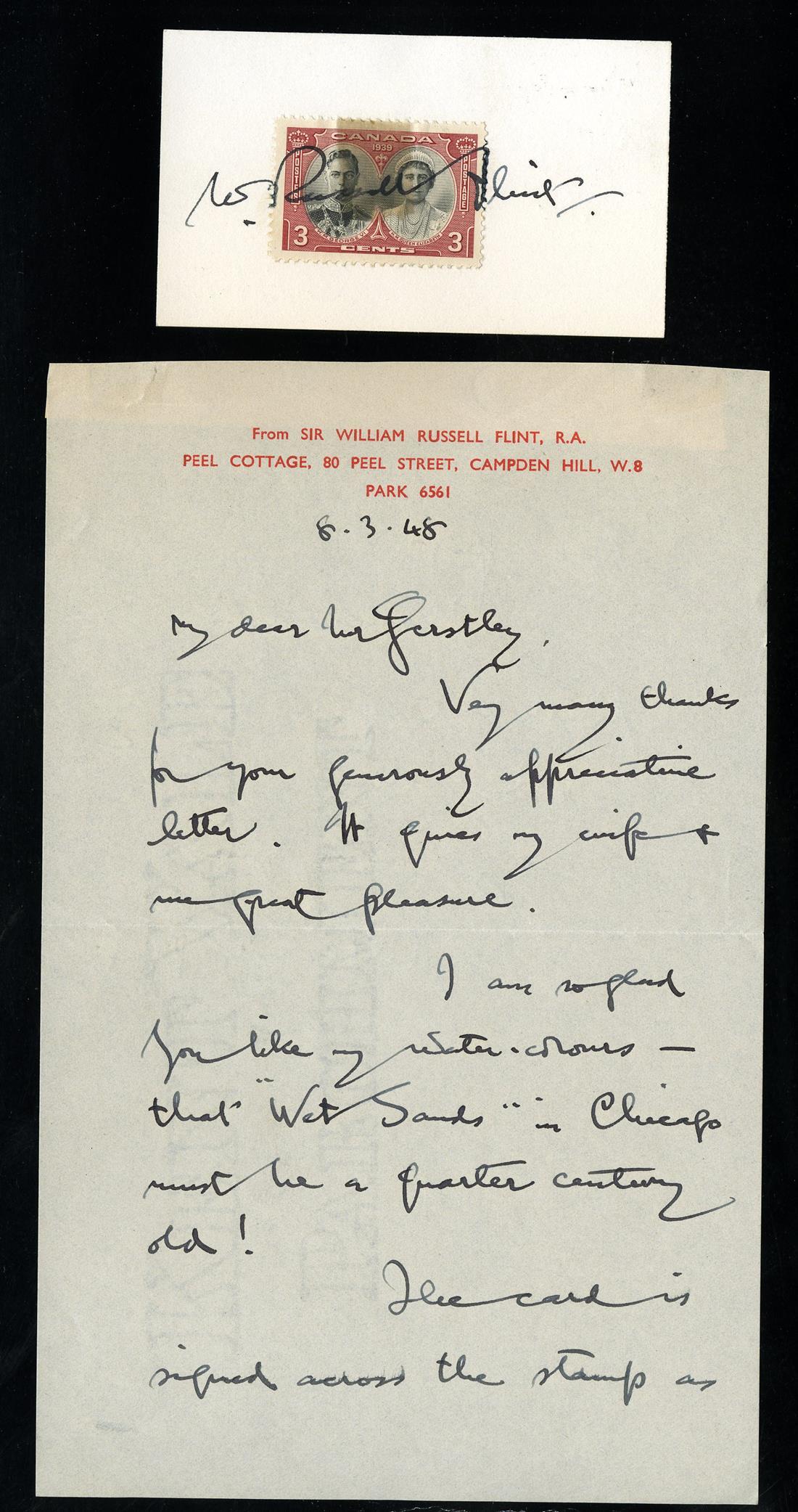 Flint, Sir William Russell (1880-1969). Scottish artist and illustrator known especially for his watercolor paintings of women. Autograph Letter Signed "W Russell Flint". 1 ½ pages on Flint, R.A., Peel Cottage stationery, 5 1/3 x 8", 8 March 1948. Flint thanks Mr. Gerstley for his "generous appreciative letter", gives his best wishes and encloses an autographed postage stamp. Accompanied by the aforementioned stamp, a 1939 Canada Royal Visit 3 Cent stamp signed across in black ink "W. Russell Flint". Dark toning area on stamp, and old paper backing top of letter, Fine. [2]