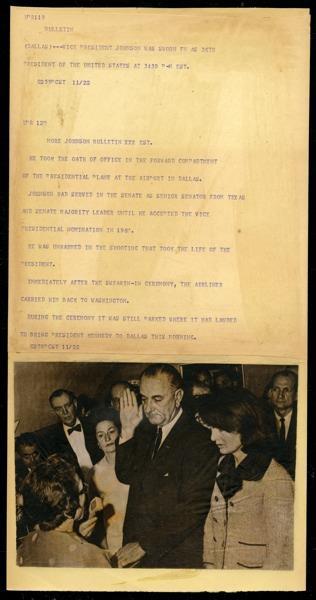 Johnson, Lyndon Baines; Kennedy Assassination: United Press wire story and wire photo of Johnson's swearing-in, Nov. 22, 1963. One page folio. "BULLETIN (DALLAS) --- VICE PRESIDENT JOHNSON WAS SWORN FN AS 36TH PRESIDENT OF THE UNITED STATES AT 3:39 P-M EST….HE TOOK THE OATH OF OFFICE IN THE FORWARD COMPARTMENT OF THE PRESIDENTIAL PLANE AT THE AIRPORT IN DALLAS…HE WAS UNHARMED IN THE SHOOTING THAT TOOK THE LIFE OF THE PRESIDENT…" Below the wire photo shows LBJ raising his hand, a distraught Jacqueline Kennedy by his side, in the somber ceremony. Some age toning, About Very Fine.