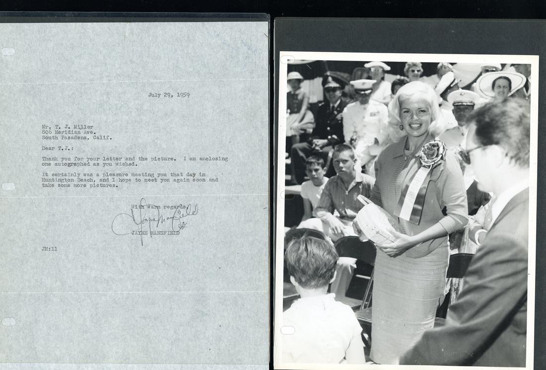 Mansfield, Jayne (Vera Jayne Palmer). Major Hollywood sex symbol and one of the original blonde bombshells; nightclub entertainer, singer, early Playboy Playmate, film, theatre and television actress; an celeb icon of the 1950's. Letter Signed "Jayne Mansfield". One page, typed, 8 ½ x 11", July 29, 1959. Jayne thanks Mr. T.J. Miller for his letter, and expresses her pleasure at having met him in Huntington Beach. She signs below. Some parts of the signature are characteristic of Mansfield's autograph, but there are uncharacteristic elements, and it may be a "secretarial" signature instead. About Very Fine. Accompanied by an 8 x 10", b&w photo of a smiling Mansfield at a public event - military or civic ceremony or parade review. [2]