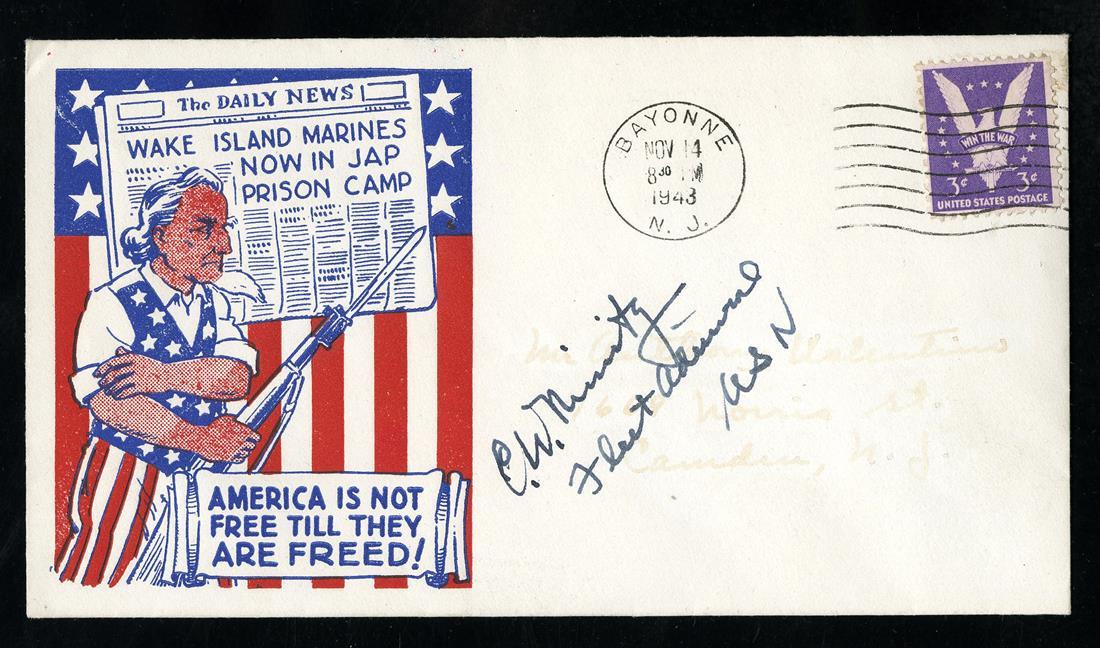 Nimitz, Chester William. Fleet Admiral United States Navy; during WWII, Nimitz was Commander-in-Chief of the US Pacific Fleet and Commander-in-Chief, Pacific Ocean Areas, of the US and Allied air, land and sea forces. Nimitz signed for the United States when Japan formally surrendered Sept. 2, 1945 on board the battleship Missouri in Tokyo Bay. Cover Signed "C.W. Nimitz Fleet Admiral USN". Nimitz signs in black marker in the address field of a patriotic cachet envelope - Uncle Sam: "America Is Not Free Till They Are Freed" by Walter Poppenger. The envelope is postmarked "Bayonne, NJ Nov. 14 1943. Very Fine.
