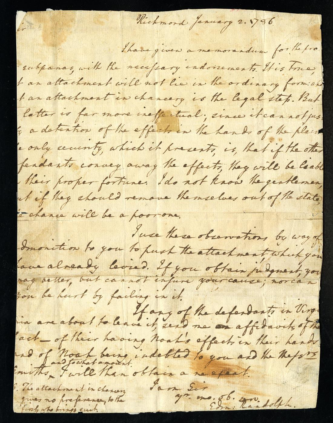 Randolph, Edmund Jennings (1753-1813). Aide-de-camp to Washington during the Revolutionary War, delegate to the Continental Congress, Governor of VA, first Attorney General of the United States, second Secretary of State of the United States (1794-1795, resigned after a foolish diplomatic lapse of good sense), defense counsel in the Aaron Burr treason trial. Autograph Letter Signed "Edm: Randolph". One page, 6 ¾ x 8 ¾", Richmond, January 2, 1786. Randolph offers legal counsel and instructions in a debt dispute and urges attachment of property of one Noah about to be removed from Virginia. The letter has been harshly cropped into the text and backed with lined paper with tape repair. The signature is clear and intact. About Very Good. Ex the Reverend Paul Harwell Coll.