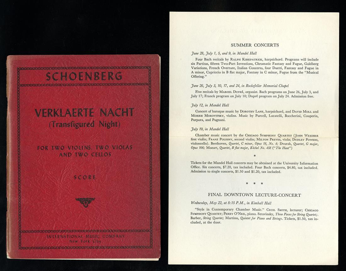 Schoenberg, Arnold (1874-1951). Austrian composer and painter associated with the expressionist movement in German poetry and art, leader of the Second Viennese School, great innovator in music without tonal centers, developed the twelve-tone technique; his approach to both harmony and development greatly influenced 20th Century musical thought; as a painter, meanwhile, he displayed considerable ability and his works have been displayed with fellow Blue Rider group artists Franz Marc and Wassily Kandinsky. Autograph Signature "Arnold Schoenberg" in blue ink on a single sheet program for the University of Chicago's Tribute to Schoenberg, May 20, 1946. Very Fine and Rare. Accompanied by the musical score for Schoenberg's Verklaerte Nacht (Transfigured Night). [2]