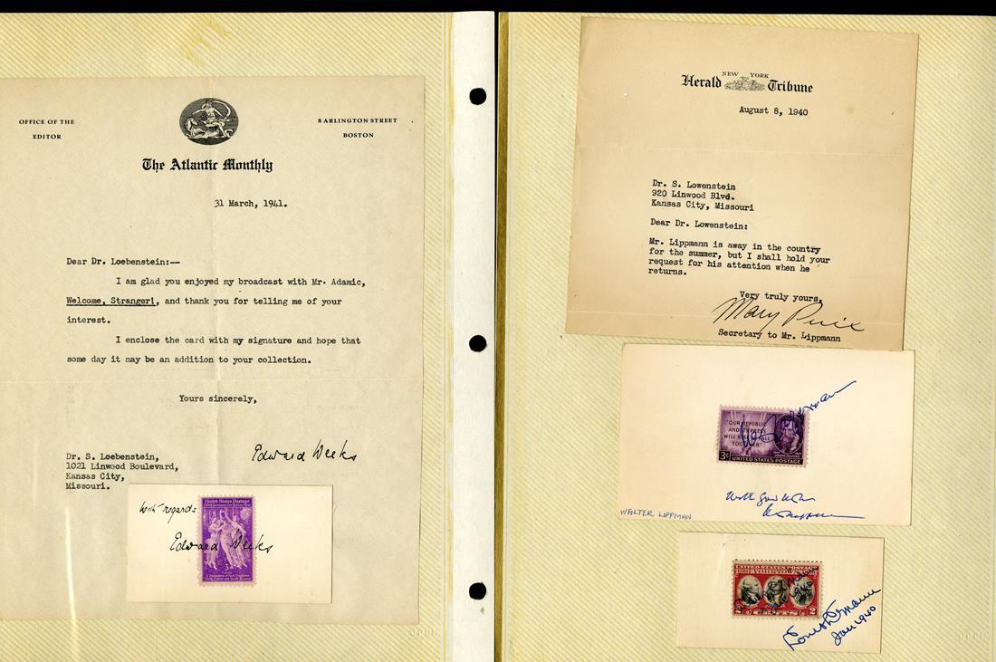 Journalism, Publishing & Literature autograph lot. Mainly on postage stamps, often with accompanying correspondence as noted: Herbert Agar, journalist, 1934 Pulitzer Prize in history winner for his book "The People's Choice" on 3 Cents "Win the War"; Edward Weeks, author, essayist, editor of "The Atlantic Monthly" (1938-1966). On 50th Anniversary of Pan-Am Union 3 Cents with Weeks signed typed letter sent with autograph; Erskine Caldwell, author who wrote of the poverty, racism and social problems in his native South, winning critical acclaim especially for "Tobacco Road" and "God's Little Acre". On block of 4 Cents Sam Rayburn; Herbert Bayard Swope, editor, journalist, intimate of the Algonquin Round Table, 3 time Pulitzer recipient. On ½ Cent stamp and dated "1941"; Arthur Hays Sulzberger publisher of the New York Times (1935-1961). On ½ Cent stamp with 1943 secretarial letter regarding autograph; Pierre van Passem, Dutch-Canadian-American journalist, writer and Unitarian minister. On 1939 Printing commemorative 3 Cents with salutation and date "Nov. 10, 1939"; Raymond Gram Swing, one of the most influential commentators of his era, leading American voice from Britain during WWII. On 5 Cents "Teddy" Roosevelt with 1941 secretarial letter regarding autograph; renowned newspaper editor and Progressive movement leader William A. White (1868-1944). On '39 Printing commemorative 3 Cents; Henry J. Haskell, columnist for the Kansas City Star and Kansas City Times. On 6 Cents and dated "December 12, 1939"; noted publisher Alfred A. Knopf on 1939 Statehood 3 Cents with secretarial letter sent with autograph; Vincent Sheean, journalist and novelist, reported for the New York Herald Tribune during the Spanish Civil War. On Panama Canal anniversary 3 Cents; Walter Lippman, writer, reporter, political commentator famed for being one of the first to introduce concept of the Cold War. On 3 Cents Pulitzer, with addition autograph below. Accompanied by autograph correspondence; investigative journalist Seymour "Sy" Hersh. ALS; war correspondent, journalist and playwright Marcel Wallenstein (1893-1986). With salutation on small card; writer Konrad Bercovici (1882-1961). On Gilbert Stuart 1 Cent with accompanying letter dated 1942 in Bercovici's hand; author Louis L. Mann with date "Jan 1940" on 2 Cents Yorktown; uncertain "Red is my color Leon Rosenwald Dec. 24 1940" on strip of 3 2 Cents, and two other uncertain. Note: letters, and some of the autographs, are on old semi-adhesive photo pages. About Fine-Very Fine. [25]