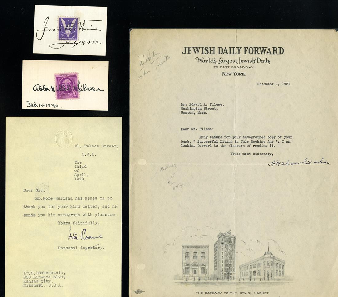 Judaica; Jewish leaders lot: Abraham Cahan (1860-1951). British-American socialist news editor, novelist, politician, a founding father, and the patriarch of the Jewish Daily Forward until 1946. Letter signed, typed on the Jewish Daily's letterhead, Dec. 1, 1931, thanking Edward Filene for the autographed copy of his book; Yitzhak Shamir, 7th prime minister of Israel. His autograph on a large white card; Dr. Joshua Loth Liebman (1907-1948), American rabbi and best-selling author. Letter signed, typed on his letterhead, June 30, 1947. Liebman thanks Mrs. Gerstley for her letter and encloses his autograph on a Grand Canyon 2 Cent commemorative postage stamp - included in lot; Sholem-Asch (1880-1957), Polish-born American novelist, dramatist and essayist in the Yiddish language. His autograph on a small card; Abba Hillel Silver (1893-1963), rabbi and Zionist leader. His autograph, dated Feb. 13 - 1940, on a 3 Cent Ralph Waldo Emerson stamp; Jonah B. Wise (1881-1959), rabbi of NY's Central Synagogue, leader of the Reform Judaism movement and founder of the United Jewish Appeal. His auotograph, dated July 14, 1942, on a 3 Cent "Win the War" stamp; Isidor Loeb, professor of law, University of Missouri. Autograph Letter signed, April 27, 1941. Loeb thanks an autograph seeker and sends his autograph on a Horace Mann 1 Cent commemorative stamp - included in lot; Leslie Hore-Belisha (1893-1957), British Liberal, MP and cabinet minister, alleged victim of anti-Semitism. His autograph on a House of Commons embossed notepaper, with 1940 secretarial letter that was sent with autograph. Light mount stains on one letter, some mount marks on blank backs of some cards, on average Fine. [11]