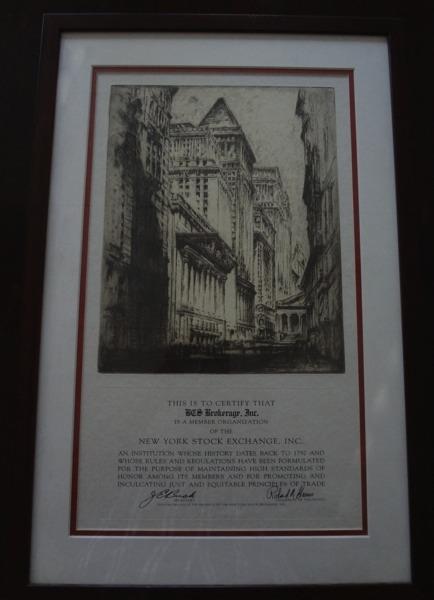 New York Financial: New York Stock Exchange Membership Certificate. Certifying BCS Brokerage, Inc. as a member organization. Large, handsome charcoal illustration of the NYSE above inscription. Choice Very Fine. Matted and framed (15 1/3 x 23 1/8").