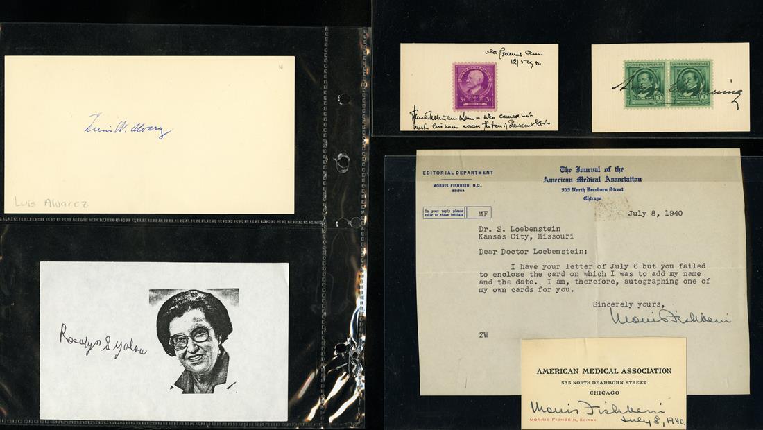 Rocket Science, Physics and Medicine: Autograph signatures of German-American rocket scientists and members of Wernher von Braun's teams at the U.S. Army and NASA: Georg v. Tiesenhausen, Erich Engler and Rudolf F. Hoelker. On large cards, Hoelker's with salutation, the other two with lists of projects they were involved in (in their hand); Maxime Faget, Belize-born American mechanical engineer, designer of the Mercury capsule, and contributor to the Gemini and Apollo spacecraft. His signature on a large card; uncertain signatures (2) on two color photos of man with rocket models; Luiz Walter Alvarez, experimental physicist, inventor and professor, recipient of the 1968 Nobel Prize for Physics. His signature on large card; Rosalyn Sussman Yalow, medical physicist, co-winner of the 1977 Nobel Prize in Physiology or Medicine. Her signature by small Xerox of her picture; Logan Clendening, leading medical historian of his time. His signature across a pair of 1 Cent Washington Irving stamps on card; pioneer surgeon Leonard Bailey, signature "Len Bailey" on large card; Dr. Robert Gallo, biomedical researcher, best known for discovering HIV and developing HIV blood test. His signature on large card; uncertain signatures (2) on Health Research FDCs; also George Washington University law professor Jeffrey Rosen, signature across 4 Cent Charles Evans Hughes stamp with note in his hand and mailing envelope; and 4 other autograph signatures - medical and uncertain. Generally Very Fine to Choice. [18]