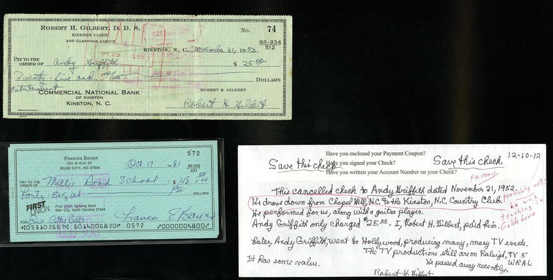 Television Stars: Andy Griffith. Actor, TV producer, gospel singer and writer, perhaps best known for his 1960-1968 sitcom "The Andy Griffith Show." Document Signed "Andy Griffith Box 635". Check payable to the order of Andy Griffith for $25, Commercial National Bank of Kinston, NC Nov. 21, 1952. Griffith endorses on verso in black ink. The payment is supposedly for a performance Andy did at the Kinston Country Club; Frances Elizabeth Bavier. Stage and TV actress, known for her role as "Aunt Bee" on "The Andy Griffith Show" and "Mayberry RFD". Autograph Document Signed. "Frances E Bavier". Bavier's check payable to the Millis Road School for $48, Siler City, NC. Bavier signs in dark blue ink lower right. Fine and Very Fine. [2]