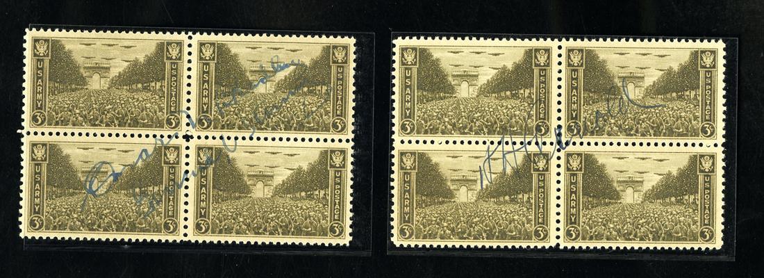 Pair of five-star U.S. Generals: Bradley, Omar Nelson (1893-1981). U.S. Army field commander in North Africa and Europe during WWII, Army general; at one point during the war, Bradley had 1.3 million men under his command; appointed the first Chairman of the Joint Chiefs of Staff in 1949; last U.S. Armed Forces member to hold the rank of five-star general. Autograph Signature "Omar N Bradley General U.S Army" in blue ink on two lines across block of four US Army 3 Cents commemorative postage stamps; Arnold, Henry Harley "Hap" (1886-1950). General of the U.S. Army and of the U.S. Air Force, aviation pilot, Chief of the Air Corps (1938-1941); commanded the U.S. Air Force during WWII, only Air Force general to hold the five-star rank, only person to hold the five-star rank in two different U.S. military forces; one of the founders of Pan American World Airways. Autograph Signature "H H Arnold" in dark blue ink across block of four US Army 3 Cents commemorative postage stamps. Both Very Fine. [2]