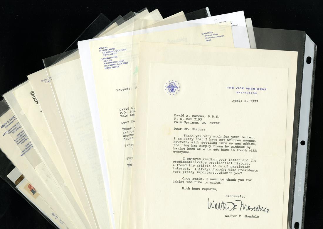 U.S. Government and Politics lot. Walter Mondale. 42nd Vice President of the United States, under Jimmy Carter. Typed letter signed, dated April 8, 1977 on "The Vice President" letterhead; also 1984 presidential election, 8 ½ x 10" color campaign photo of Mondale with running mate Geraldine Ferraro, signed by both in black marker; Yvonne Braithwaite Burke, first African-American woman to represent the West Coast in Congress, serving from 1973-1978. Typed letter signed, Nov. 28, 1978 on CA Legislature Assembly letterhead with 5 ½ x 8 ½ b&w photo of Ms. Braithwaite Burke signed in blue marker; *Typed Letters Signed by Cyrus Vance (Secretary of State 1977-1980) - Oct.2, 1980, Leonard Woodcock (first US ambassador to the Peoples Republic of China) - 1980 on embassy letterhead, Thomas J. Watson, Jr. (ambassador to the Soviet Union, 1979-1981) - 1980 on embassy letterhead, Oklahoma politician Carl Albert (the "Little Giant from Little Dixie") - 1979, Clark M. Clifford (lawyer, political advisor to Truman, JFK, LBJ and Carter) - 1982 with handwritten comment by military analyst Daniel Ellsberg, also additional Clifford autograph on white card, Allan Cranston (journalist and CA Senator) - two letters 1982 and 1986, media personality and commentator James Carville; *Autograph Letters Signed by Owen Lattimore (author, educator and influential scholar of China and Central Asia) - good contents mainly on China in 2 pages, on Rutgers University letterhead (where Lattimore was doing a semester as a visiting professor) 5 Feb. 1979, George Kennan (advisor, diplomat and historian) - 1981, Boston politician John W. McCormack - 1979 with addressed envelope in his hand; *Autograph Signatures of commentator, columnist, politician Pat Buchanan, Frank Carlucci (Secretary of Defense 1987-1989), Civil Rights leader Julian Bond; CIA Director (1966-1973) Richard Helms and Samuel Dash (chief counsel during Watergate) on 8 1/3 x 4" white cards; and Typed Letter Signed by Texas Congressman Henry B. Gonzalez, Oct. 20, 1987 with autographed copy of House Resolution 111 (to impeach Ronald Reagan for "high crimes and misdemeanors") - both signatures in blue marker, autograph signature of Earl Butz (Secretary of Agriculture under Nixon and Ford) with salutation on Richard M. Nixon cachet envelope, signed b&w photo of Civil Rights leader Barbara Jordan, and large color Nixon family photo postcard signed on verso by Julie Nixon Eisenhower and David Eisenhower -- both in black marker. Generally About Very Fine-VF. [27]