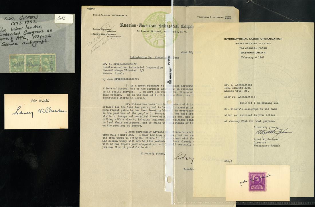 U.S. Labor lot: Sidney Hillman (1887-1946), head of the Amalgamated Clothing Workers of America (ACWA), key figure in the founding of the Congress of Industrial Organizations. Typed Letter signed "Sidney Hillman". One page on Russian-American Industrial Corporation letterhead, June 23, 1923. Hillman writes to Mr. A. Krasnoshchokoff, in the corporation's Moscow office to introduce Edward A. Filene, head of one of Boston's largest department stores, who is visiting Russia on the advice of Hillman. The Russian-American Industrial Corporation was the product of Hillman's visit to the Soviet Union in 1921 there he established a cooperative commercial venture between an organization of American shareholders and various Soviet state manufacturing trusts. The initial capital for the venture came from the ACWA. RAIC's Soviet partner was the All-Russian Clothing Syndicate. Along with the signed letter is Hillman's autograph on a small card dated July 16, 1940 (tape residue on back); William Green, president of the American Federation of Labor (1924-1952). Autograph across strip of 3 One Cent postage stamps; John G. Winant (1889-1947), governor of New Hampshire, first head of Social Security, head of the International Labor Office in Geneva. His autograph across a 3 Cent James R. Lowell stamp with letter signed by the International Labor Organization's D.C. branch director which was sent with the autograph (affixed to letter). About Fine-Fine+ [5]