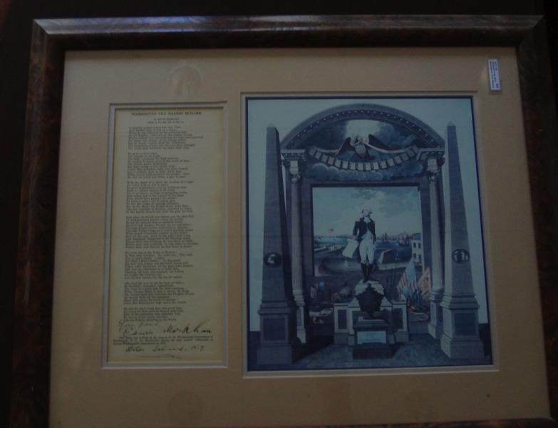 Washingtonia; Edwin Markham. Markham-signed copy of his poem "Washington the Nation Builder" written for the Bicentennial of Washington's Birth, 1932. Edwin Markham (1852-1940) was a noted poet and bibliophile of his time, and served as the Poet Laureate of Oregon from 1923 to 1931. He signs below the last verse "Your friend, Edwin Markham" and "Staten Island, N.Y." beneath the Bicentennial note. Very Fine. Matted side by side with an ornate Washington depiction between two obelisks in color and attractively framed.