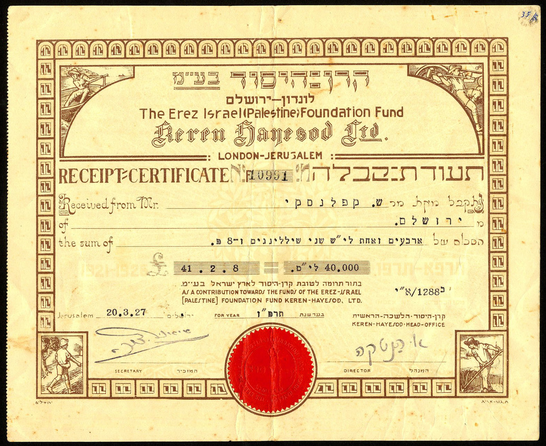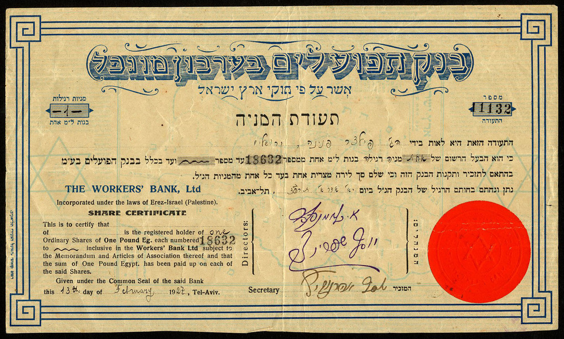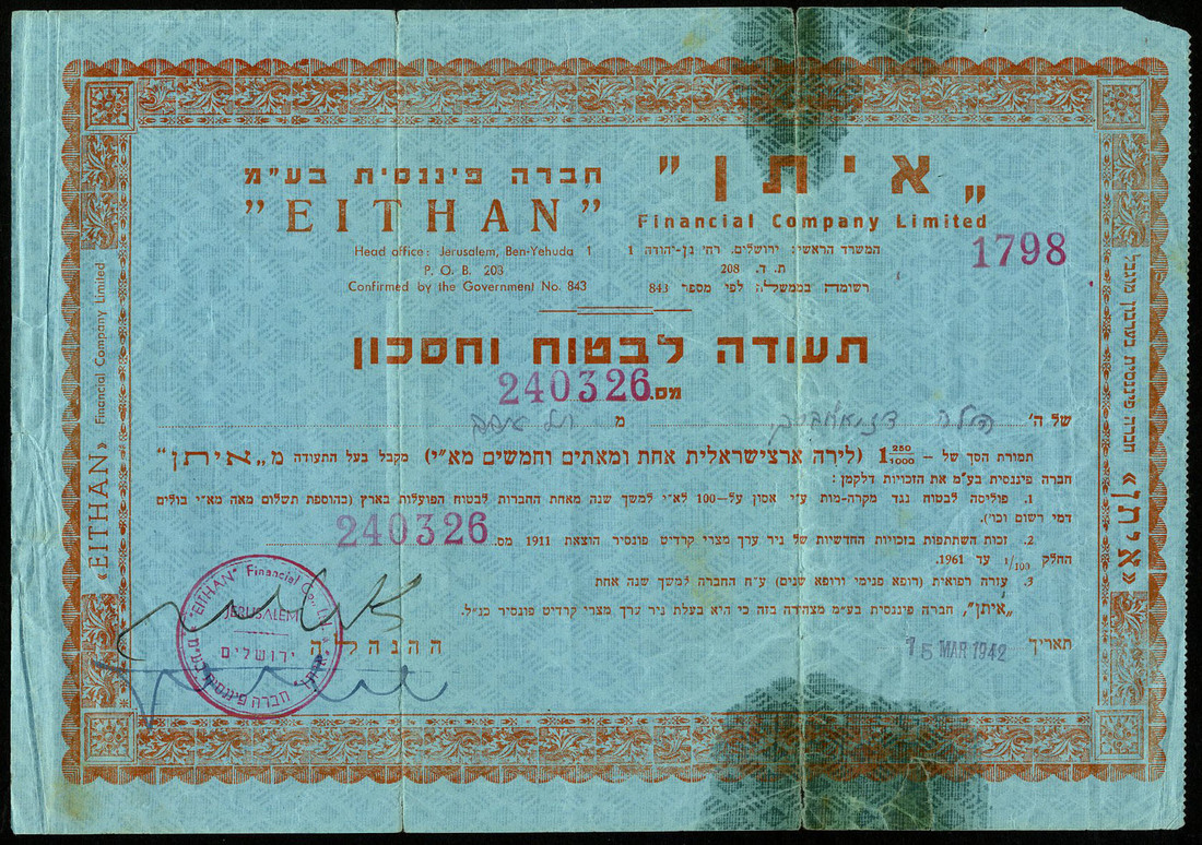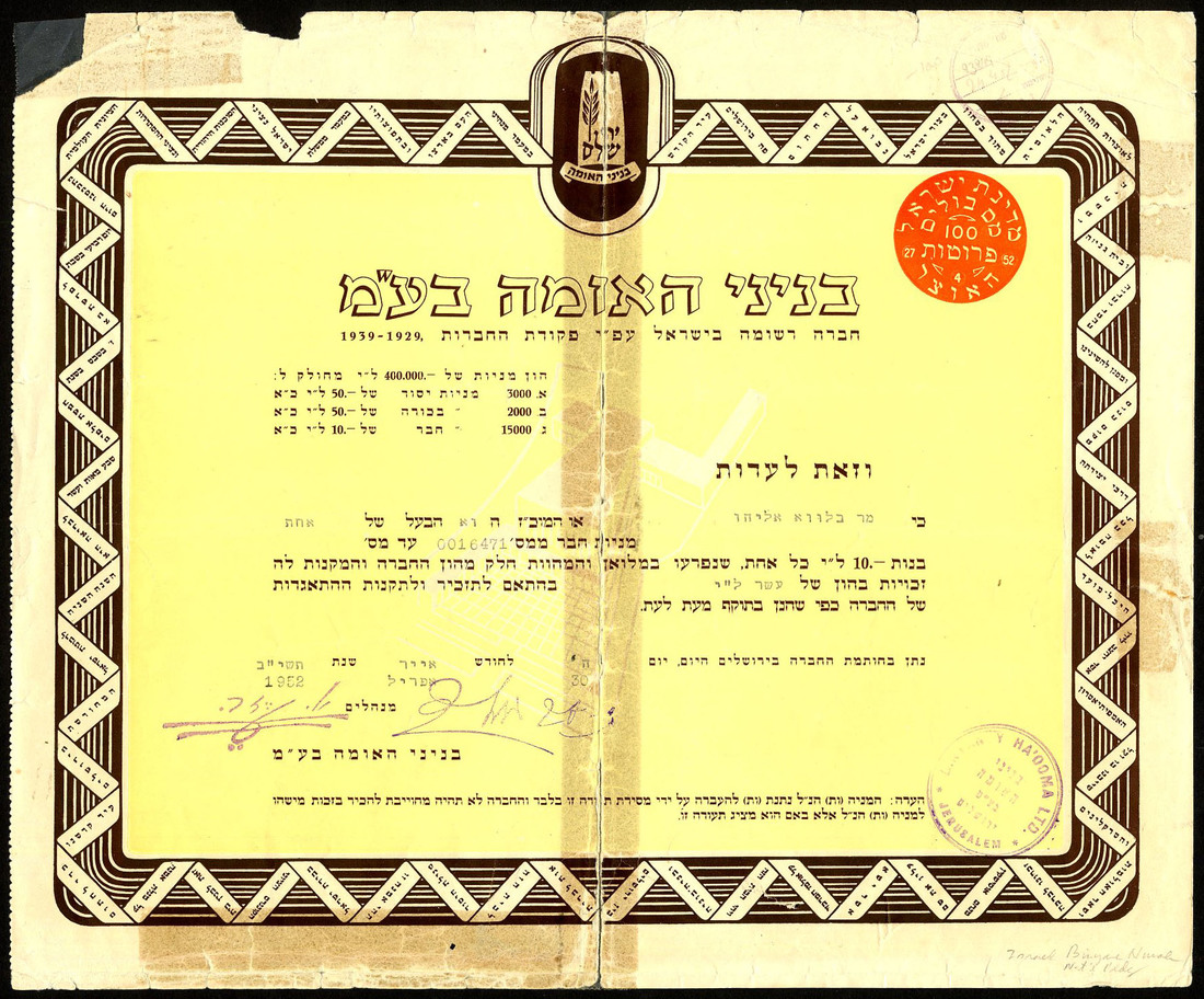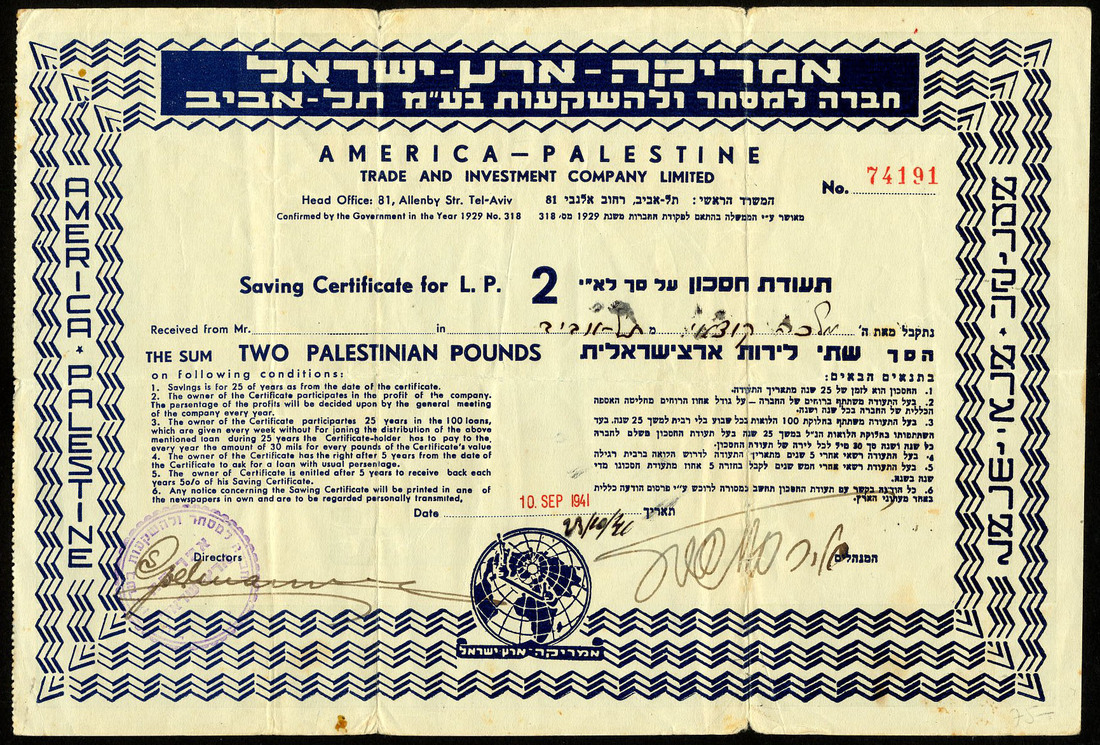 A group of share and savings certificates, comprising Eithan Financial Company Ltd., [1942]; Workers' Bank Ltd., 19[27]; Binyan Ha'ooma Ltd., 1952; America-Palestine Trade & Investment Co. Ltd., savings certificate, [1941], and Keren-Hayesod Ltd., contribution certificate for the founding of Palestine, [1927], mixed condition, the first stained, the 4th poor, fine to very fine. (5)