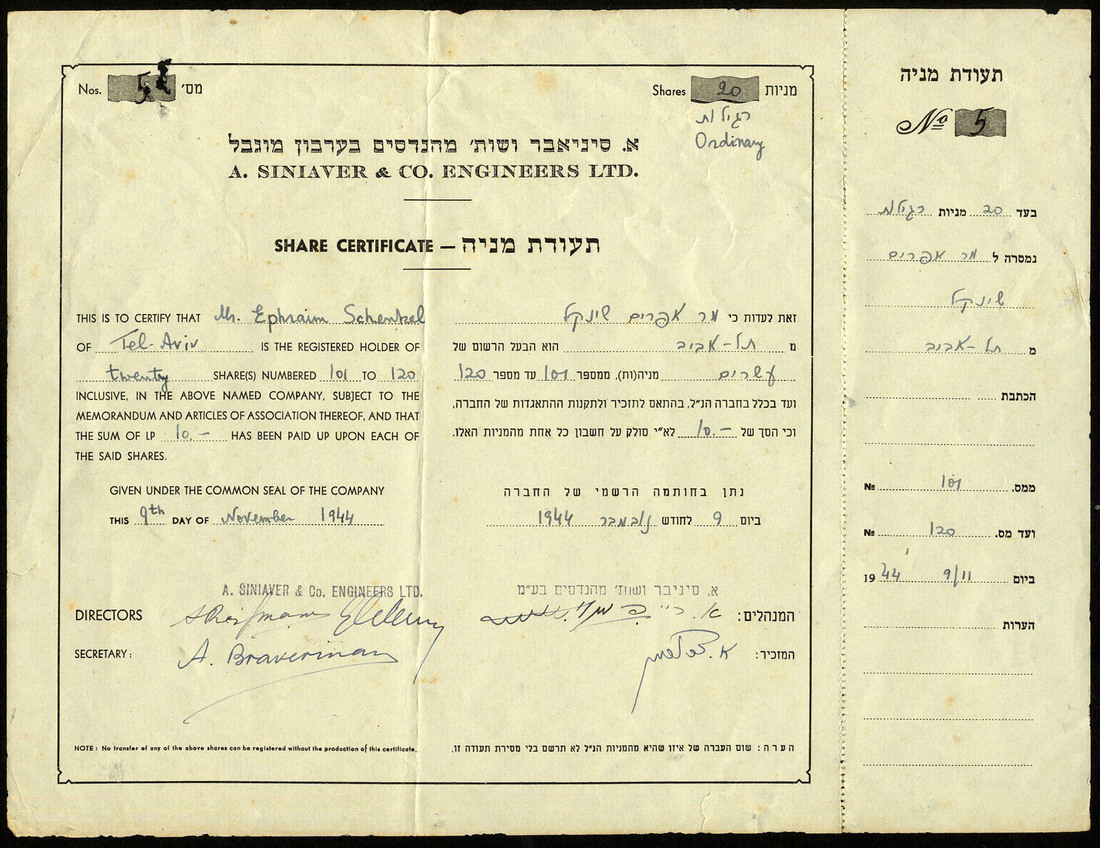 A. Siniaver & Co. Engineers Ltd., certificate for [20] shares of P£10, [1944], #5, text in English and Hebrew, black, counterfoil still attached at right, pinholes top left, about very fine and rare