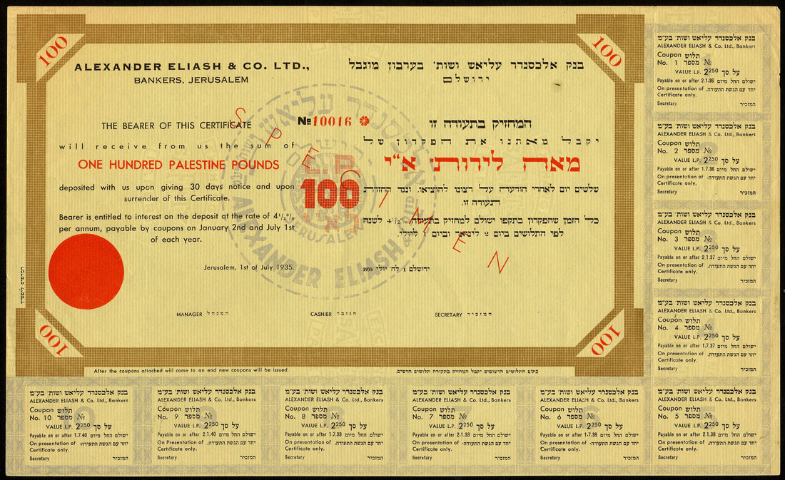 Alexander Eliash & Co. Ltd., Bankers, Jerusalem, a specimen deposit certificate for P£100, 1935, ornate border, text in English and Hebrew, red and brown on cream paper, overprinted SPECIMEN in red, with coupons, extremely fine and rare.