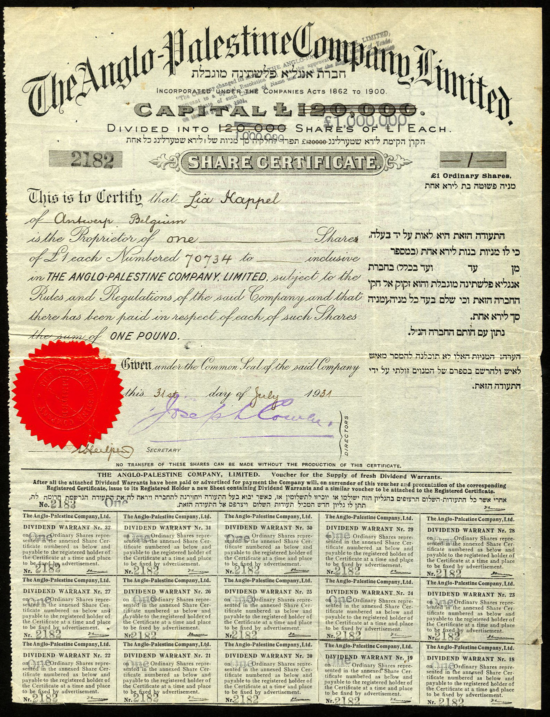 Anglo-Palestine Co. Ltd., £1 shares, 19[31], #2182, black printing with text in English and Hebrew, red seal, capital overprinted with increase, with coupons, about very fine and scarce with coupons intact.
