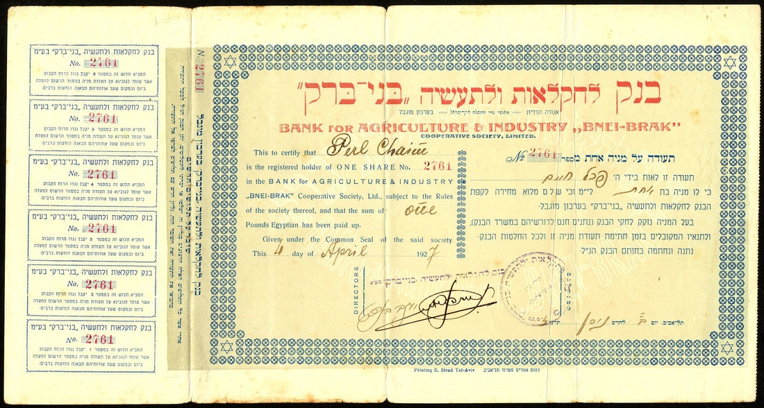 Bank for Agriculture & Industry "Bnei-Brak" Cooperative Society Ltd., one share, 192[7], #2761, ornate border, text in English and Hebrew, green and red, with coupons at left, good fine and scarce.