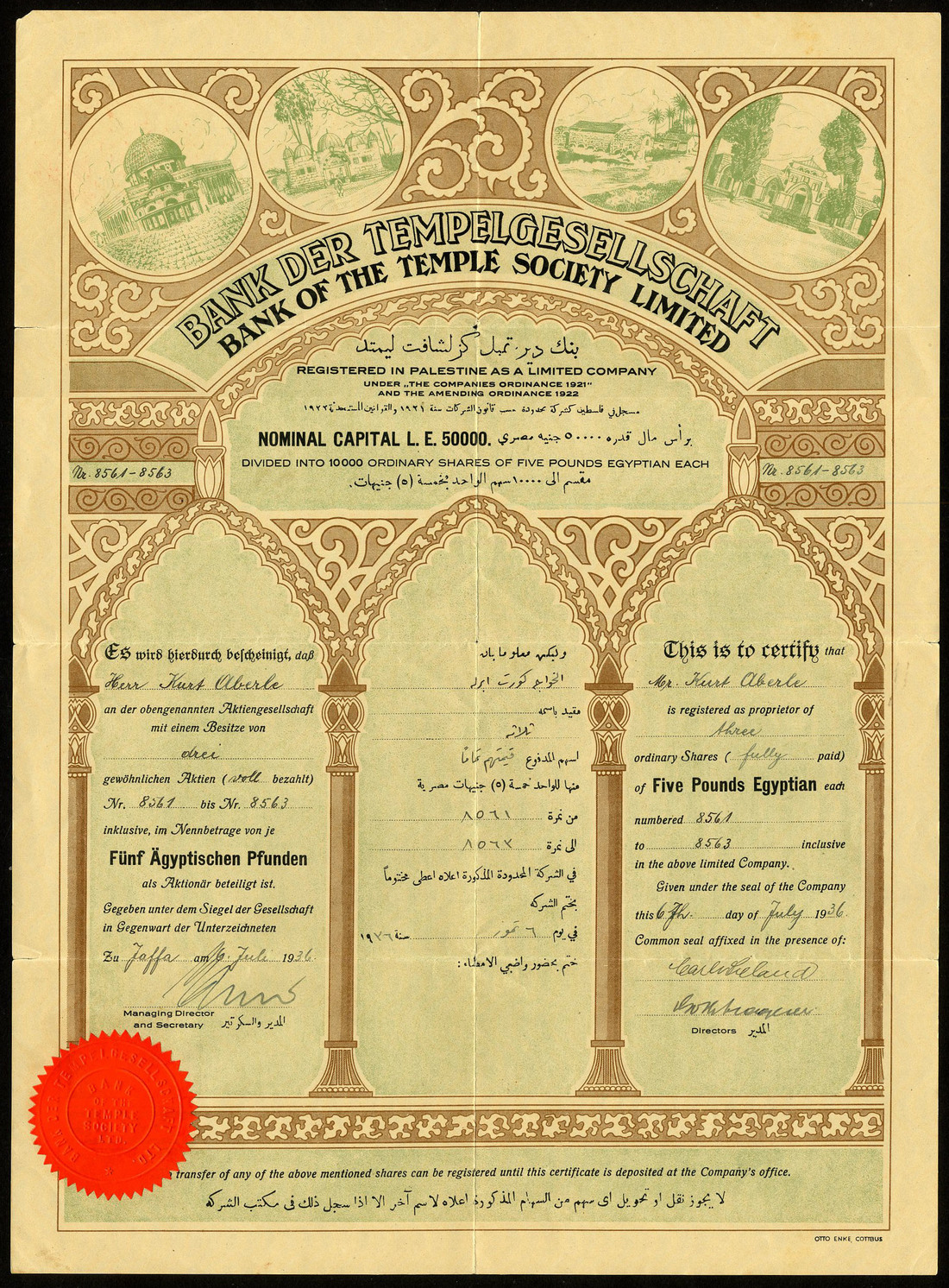Bank of the Temple Society Ltd., shares of 5 Egyptian pounds, 19[36], #8561-8563, large format piece with eastern architectural design, vignettes of various buildings at top, text in German, Arabic and English, green and brown, red seal, split at folds but very fine and rare.