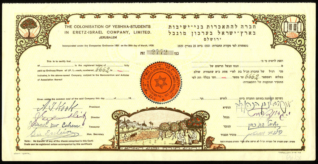 Colonisation of Yeshiva-Sudents in Eretz-Israel Co. Ltd., P£1 share, undated but circa 1930, #2772, colourful piece with workers in field at bottom, scrolls top right, orange tree top left, text in English and Hebrew, multicoloured, red seal, extremely fine.
