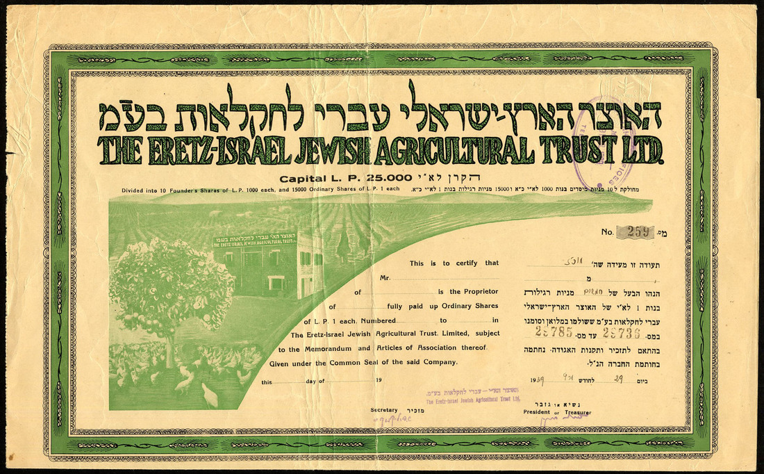 Eretz-Israel Jewish Agricultural Trust Ltd., P£1 ordinary shares, 19[39], #259, vignette of building, orange tree and chickens, text in English and Hebrew, with coupons, centre fold, couple of insignificant edge splits, very fine