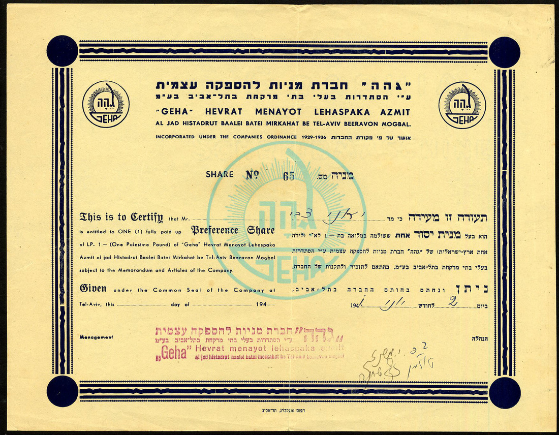 "Geha" Hevrat Menayot Lehaspaka Azmit, certificate for 1 preference share of P£1, 194[1], #65, ornate border, text in English and Hebrew, split along centre fold otherwise very fine.