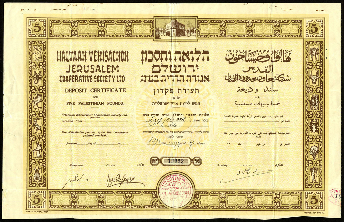 Halvaah Vehisachon Jersulaem Cooperative Society Ltd., deposit certificate for P£5, 19[33], #13023, ornate border with building top centre, brown and yellow, slight rust marks in top margin, very fine.