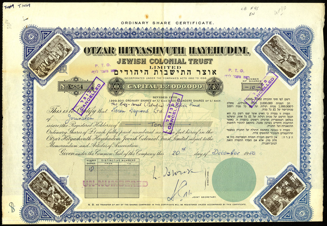 Otzar Hityashvuth Hayehudim, Jewish Colonial Trust Ltd., certificate for £1 ordinary shares, 19[50], #K5854, large underprint map of Palestine and the Red Sea, vignettes in each corner including worshippers at the wailing wall, text in English and Hebrew, blue and black, yellow underprint, green seal, with coupons, couple of tone spots but good very fine and scarce late issue.