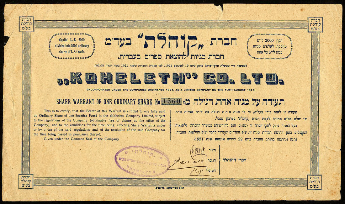 "Koheleth" Co. Ltd., warrant for one ordinary share of E£1, 1921, #1360, ornate border, text in English and Hebrew, blue, lacks coupons, some edge damage with reverse repairs, fine and rare