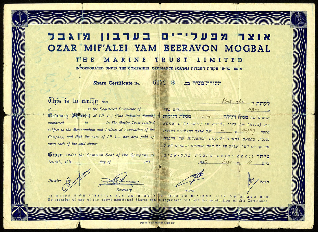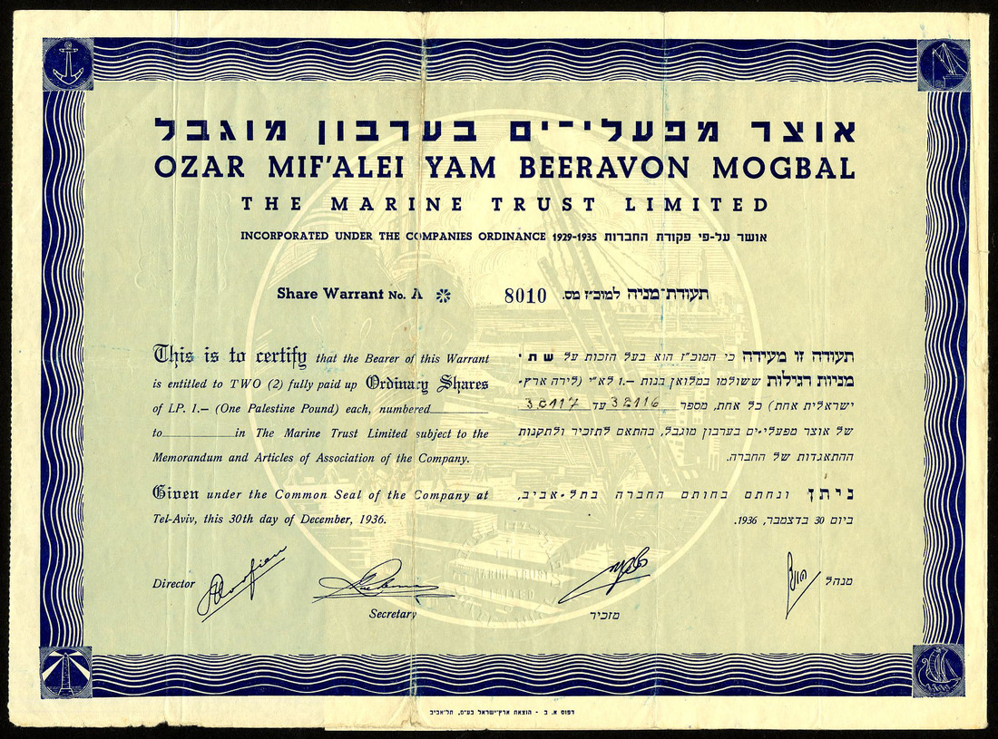 Marine Trust Ltd., pair of certificates for 2 shares of P£1, Tel-Aviv 1936, #8010 and various P£1 shares, Tel-Aviv 193[7], #6172, similar design with ornate border, text in English and Hebrew, the first with coupons, the second without, the first with heavy fold, about very fine, the second with taped repair in centre, fine.