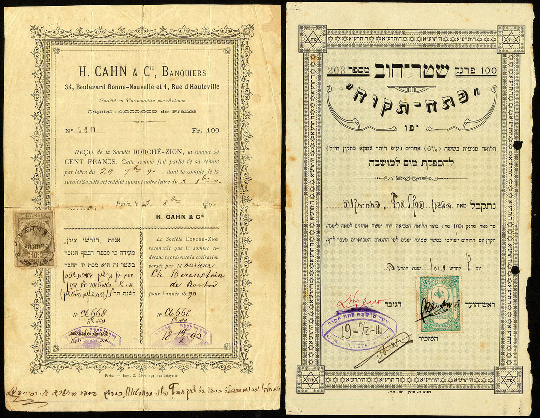 Palestine Land Settlement: Societe Dorche-Zion, subscription of 100 francs paid to H. Cahn. bankers in Paris, 1890, ornate border, black, text in Hebrew and French with rules of the society on the reverse, together with Petah Tikva, 6% Loan of 100 francs, 1912, ornate border, black, Ottoman revenue stamp, with filing holes, fine and very fine.