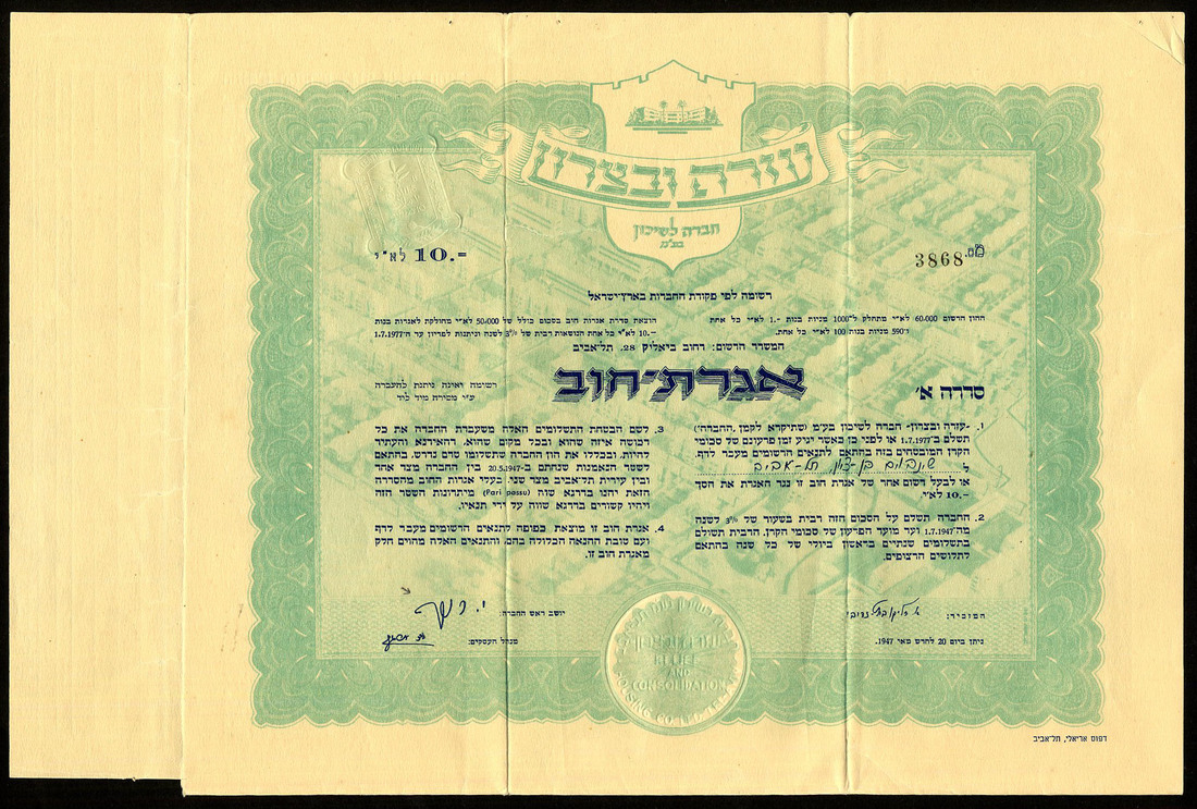 Relief and Consolidation Housing Co. Ltd., P£10 debenture, 1947, #3868, ornate border, modern building at top, huge underprint of housing suburb, green, text in Hebrew with English on reverse, with coupons, very fine but top right corner has small tear.