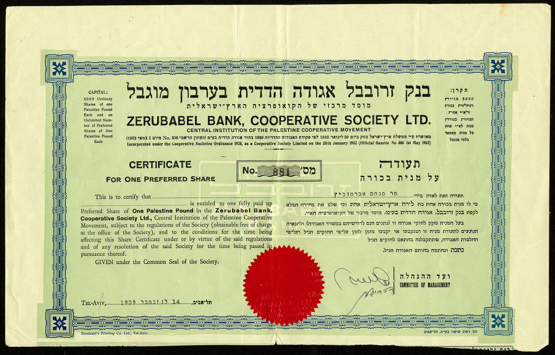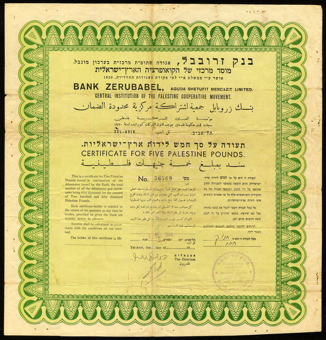 Zerubabel bank, Cooperative Society Ltd., one preferred share, [1939], #881, ornate border, blue and green, red seal, text in English and Hebrew, together with two debentures for P£5 dated [1946], large format pieces, green and black, the first very fine, the remainder fine. (3)