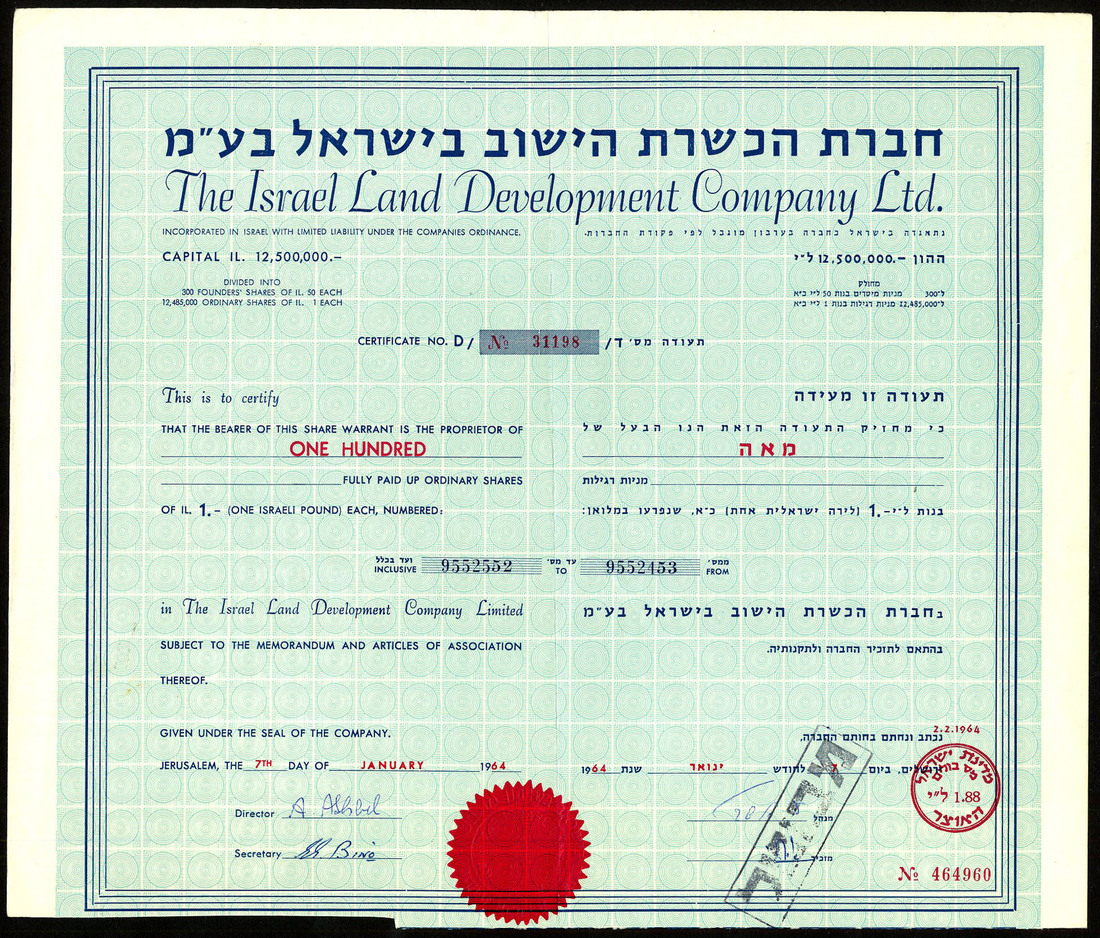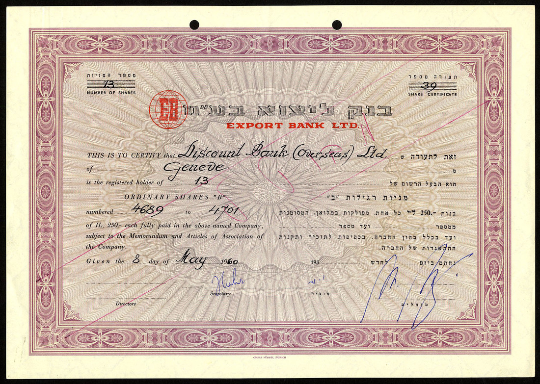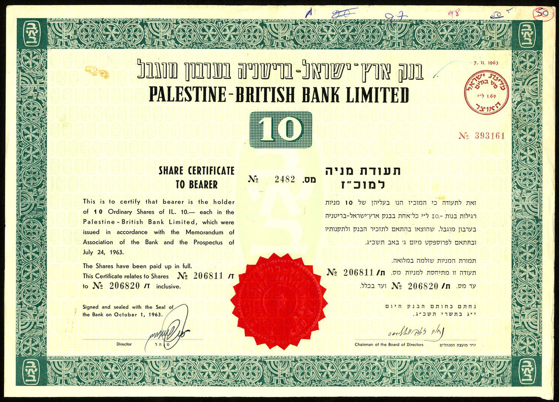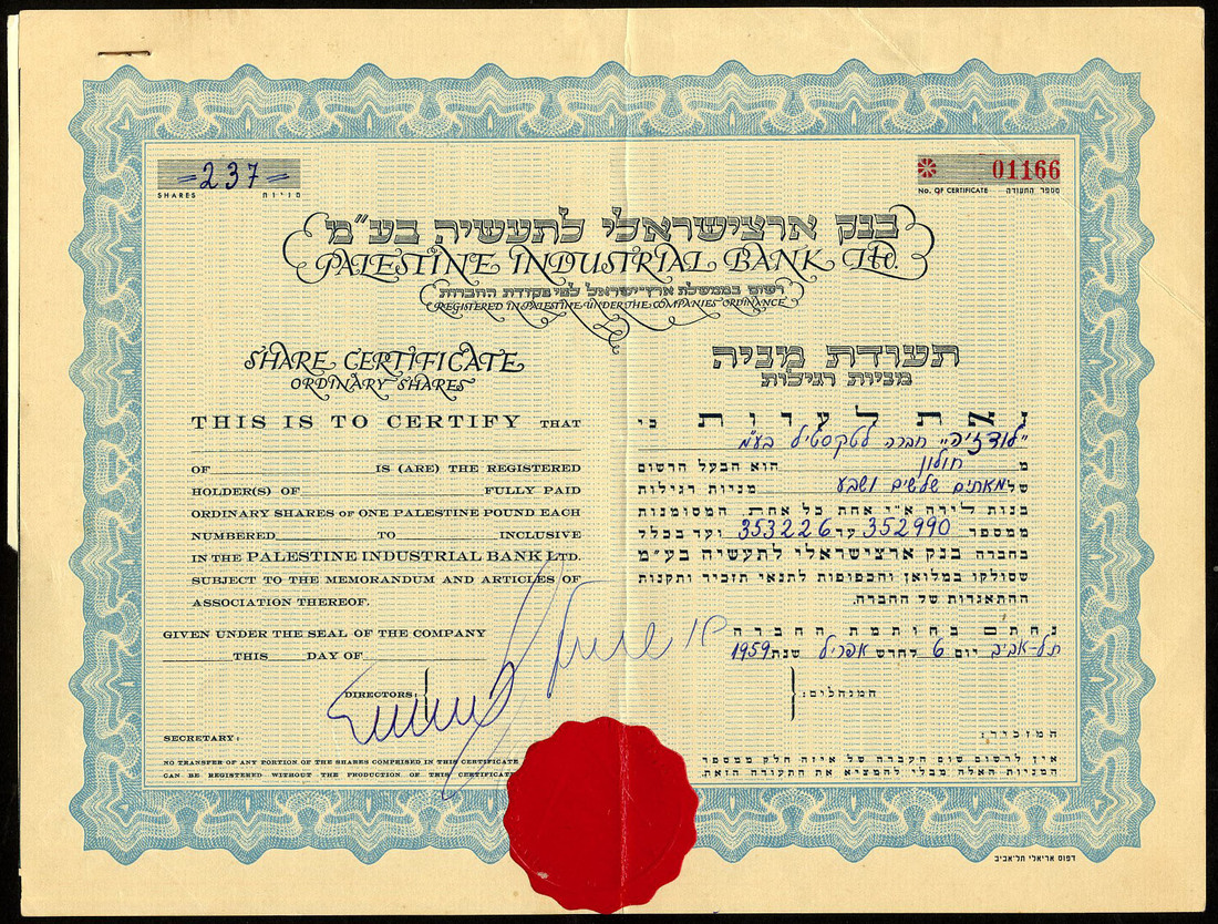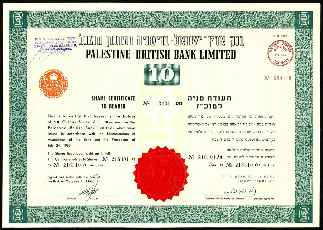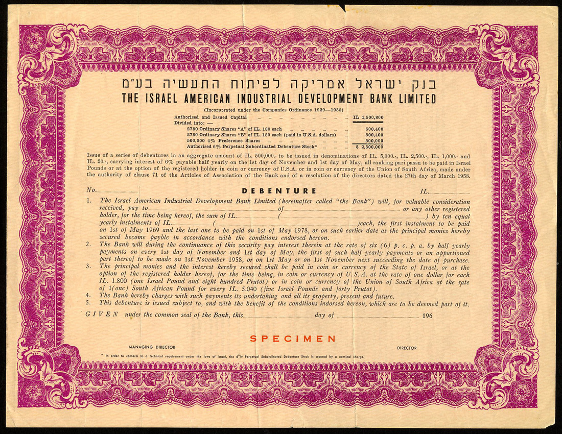 A group of more modern share certificates (6) comprising Palestine Industrial Bank Ltd., ordinary shares, 1959; a specimen debenture of the Israel American Industrial Development Bank Ltd., 196-, overprinted SPECIMEN in red; Export Bank Ltd., ordinary shares, 195[60]; Palestine-British Bank Ltd., 10 ordinary shares, 1963 (2 examples) and Israel Land Development Co. Ltd., 100 ordinary shares, 1964, all but the 2nd in both English and Hebrew, mixed condition but mostly fine to very fine, a couple better. (6)