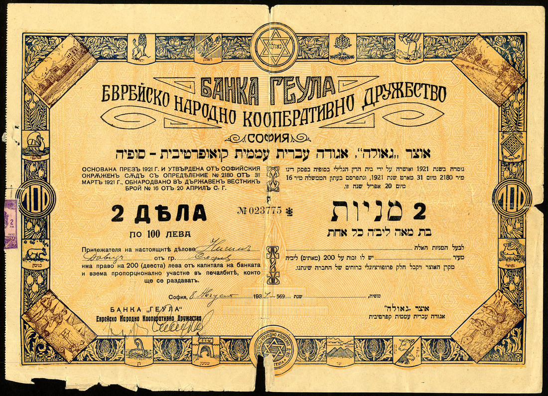 Bulgaria: Geupa Bank, Jewish Navogno Cooperative Company, certificate for 2 shares of 100 leva. Sofia 193[7], #23775, large format with ornate border of agricultural scenes, text in Bulgarian and Hebrew, blue and yellow, some splits at edges, fine but scarce