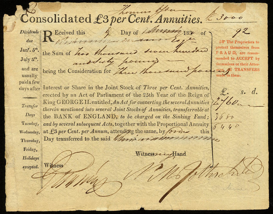 British Government, Consolidated £3 per cent Annuities, inscribed stock certificate for the sale of £3000 stock, 183[0], handsigned by Nathan Meyer Rothschild as agent, black and red, name of buyer has been obscured for privacy, top left corner missing from spiking as usual, old stamp hinges top margin, very fine.