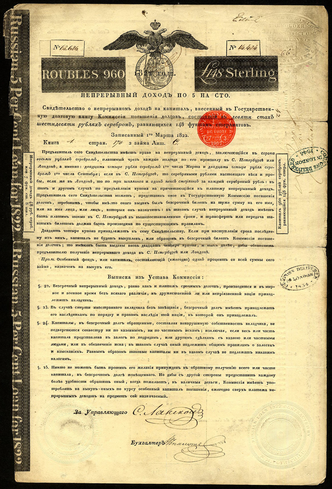 1822 5% 'Rothschild' Loan, bond for 960 roubles/£148 sterling, handsigned by Nathan Rothschild as contractor, two headed eagle at top, black printing, text in Russian on face, English and French on reverse, with talon, heavy creasing with edge tears, good fine.