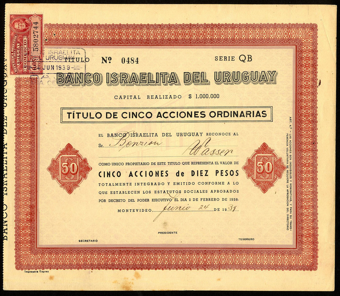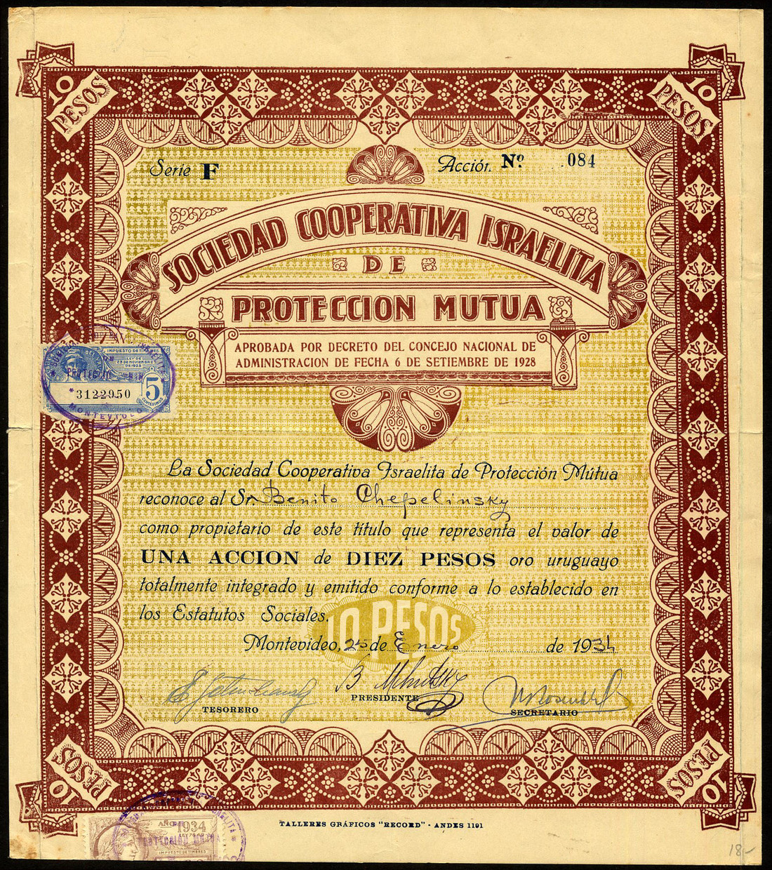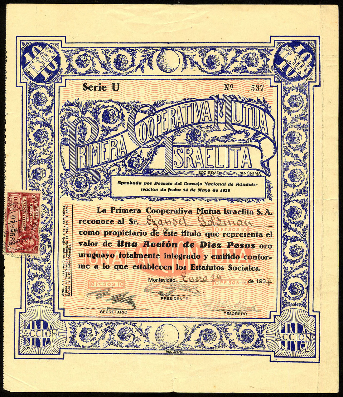Uruguay: Sociedad Cooperativa Isrealita de Proteccion Mutua, 10 peso share, Montevideo 19[34], #084, ornate border, brown and black with yellow underprint, adhesive revenue stamp; together with Primera Cooperativa Mutua Israelita S.A., 10 peso share, Montevideo 193[7], #537, ornate border, blue, pink underprint, adhesive revenue stamp, and Banco Israelita del Uruguay, 50 shares of 10 pesos, 19[39], but not signed by officers, ornate border, mauve and black, adhesive revenue stamp, very fine. (3)