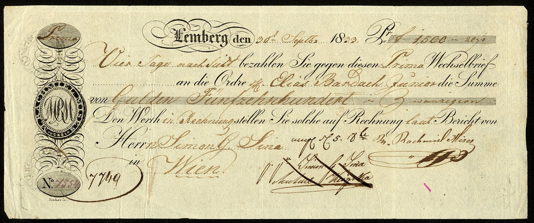 M. Rachmiel Mises: A Bill of Exchange, Lemberg, 18[33], addressed to Simon G. Sina in Vienna, to pay Elias Bardach Junior 1500 gulden, signed by M. Rachmiel Mises, endosed by Bardach on the reverse part printed bill with manuscript insertions, black, very fine and important piece.