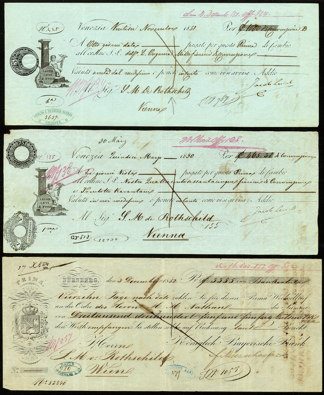 A group of Bills of Exchange all addressed to Rothschilds in Vienna: comprising two from Jacob Levi, Venice 1850 and 1851, attractive pieces signed by Jacob Levi, another from Koniglich Bayerische Bank, Nurnberg 1852, coat of arms left, payable to M.M.Nathan and endorsed by him on the reverse, another from Preres Nigra, Turin 1853, signed by him at bottom, and lastly an unissued cheque to Hersch Brecher, Saffed, circa 1915, this poor condition, the rest very fine. (5)