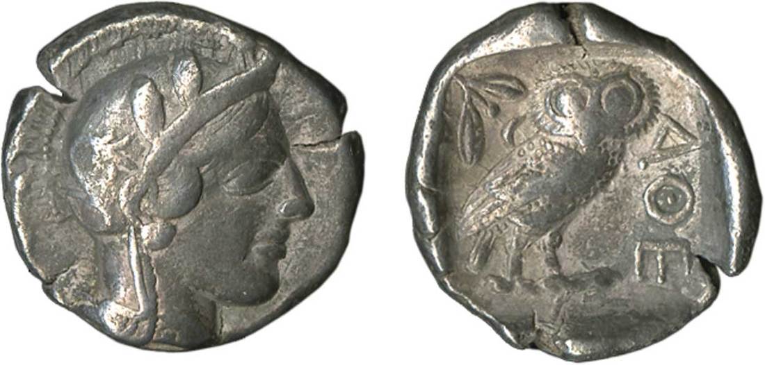 Attica. Athens. AR Tetradrachm, ca. 454-404 BC. 17.03 gms. Helmeted head of Athena right, rev. A?E, Owl standing facing, crescent and olive-sprig behind, all within incuse square. Kroll 8, SNG Copenhagen 31. A few edge splits. Well-centered on a full flan, full profile and much of the crest visible. Very Fine.