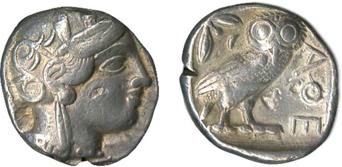 Attica. Athens. AR Tetradrachm, ca. 454-404 BC. 17.14 gms. Helmeted head of Athena right, rev. A?E, Owl standing facing, crescent and olive-sprig behind, all within incuse square. Kroll 8, SNG Copenhagen 31. Neatly applied banker's mark on check and reverse field. Full profile. Good Very Fine.