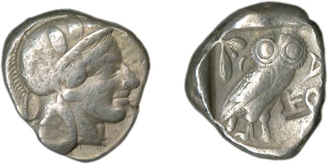 Attica. Athens. AR Tetradrachm, ca. 454-404 BC. 17.38 gms. Helmeted head of Athena right, helmet neck guard and hair coil rendered together as one design much like a beaver's tail, rev. A?E, Owl standing facing, crescent and olive-sprig behind, all within incuse square. Kroll 8, SNG Copenhagen 31. Somewhat unusual style. Banker's mark reverse field. Fine-About Very Fine.