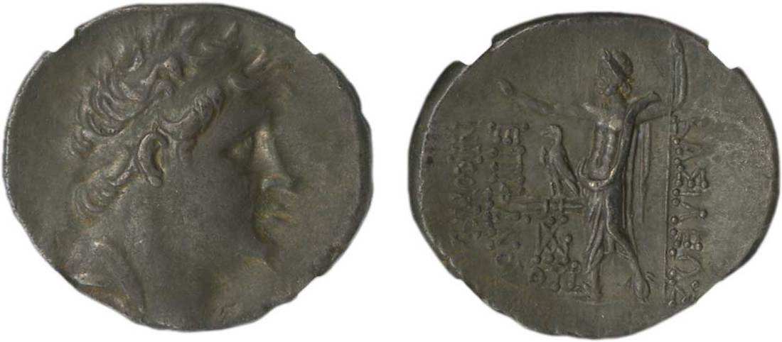 Kings of Bithynia. Nikomedes III Euergetes (127-94 BC). AR Tetradrachm, dated year 199 (99/98 BC). 15.11 gms. Diademed head right, rev. Zeus standing left holding wreath in outstretched hand and scepter, eagle on thunderbolt, monogram and date in left field. Waddington RG p.231, DeCallatäy p.59 (dies not listed), SNG v. Aulock 6897. Deep charcoal-gray with pearly hues. NGC Extremely Fine.