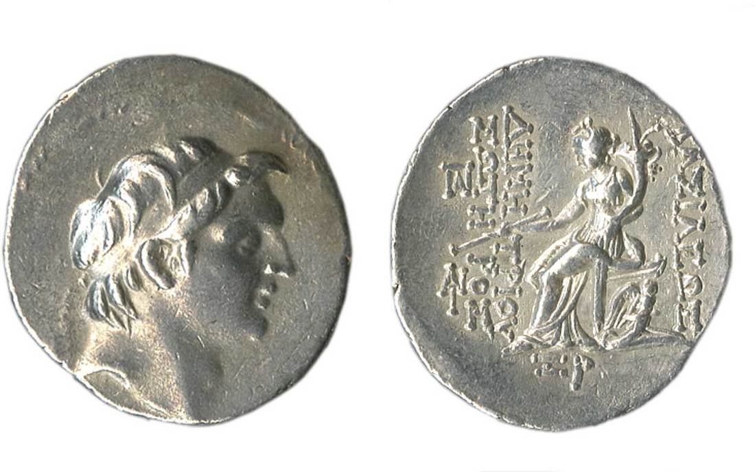 Seleukid Kings of Syria. Demetrios I Soter (162-150 BC). AR Tetradrachm, year 160 (153/2 BC). Antioch. 16.53 gms. Diademed head right within laurel wreath, rev. BA?I?E?? ?HMHTPIOY ??THPO?, Tyche setaed left, holdings scepter and cornucopiae, on throne supported by Tritonesses, two monograms outer left field, date ?P in ex. SNG Spaer 1275, SMA 113. Somewhat bright. Very Fine.
